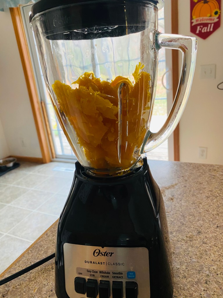 - Allow pumpkins to cool then scoop out squash and discard skins.