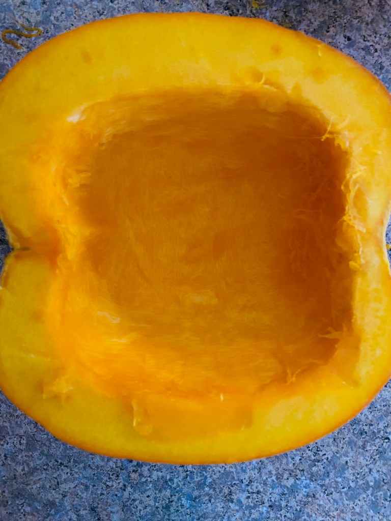 After about 45 minutes of baking I start checking my squash every 15 minutes to see if it’s done. When the pumpkins are done a fork should slip through them easily. After letting them cook you can scoop the squash out and compost the skins.