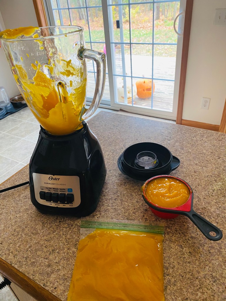 I used my blender to purée the pumpkin but you could use a food processor; I am planning to use some of my purée for baby food and I wanted to make sure I could get it blended very fine. If your purée is too thick you can add water a tablespoon at a time until it reaches your desired consistency. I then store mine in one cup portions in freezer bags for easier handling.