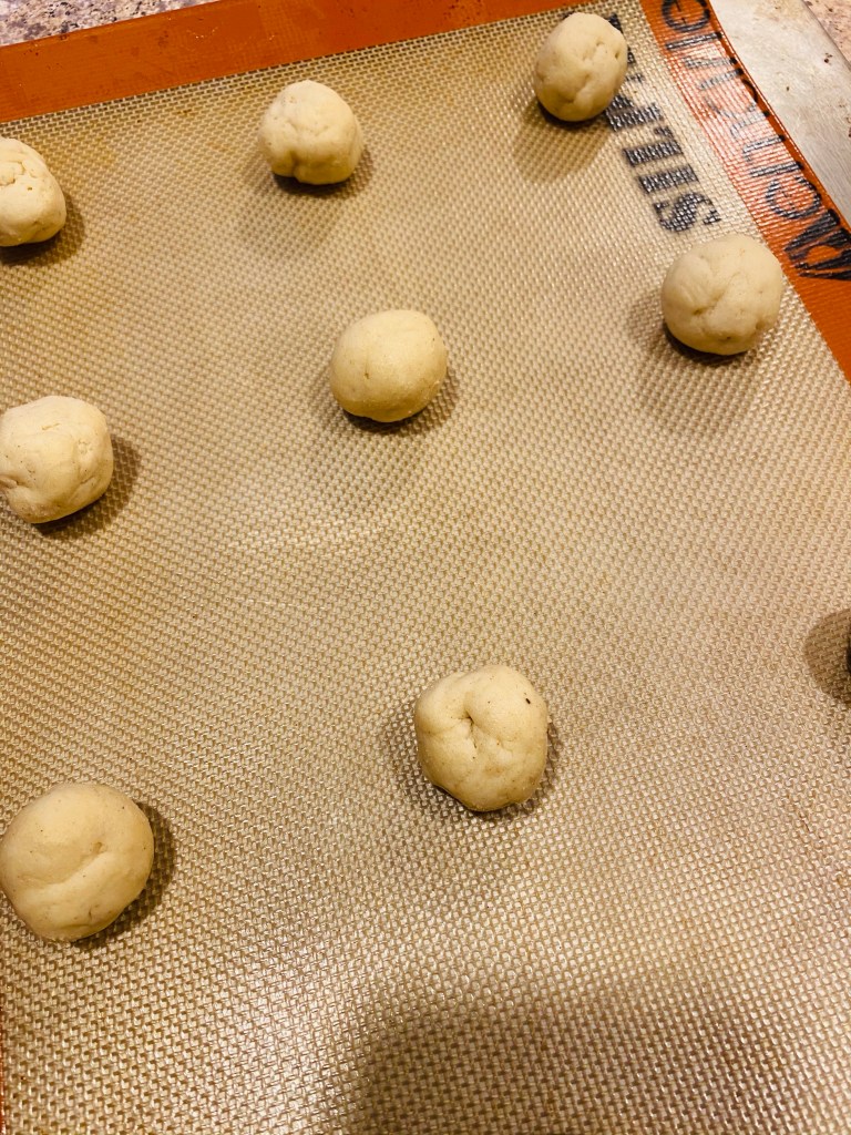 - Roll cookies into heaping teaspoon sized balls and place on baking pans approximately three inches apart.