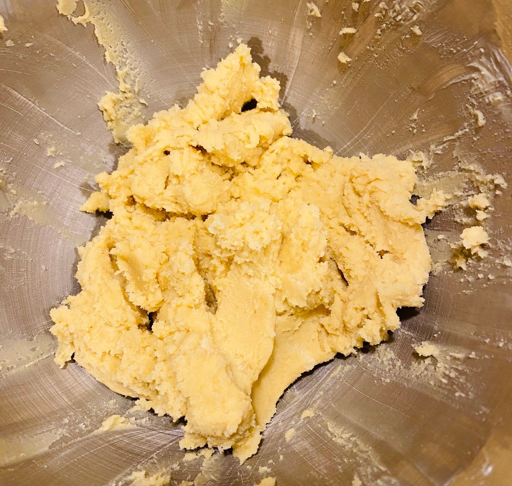 This dough is on the dry side and is very dense (similar to shortbread). When you get the ingredients mixed together it will look crumbly at first. Scrape the sides of the bowl down and keep mixing; it will eventually do its thing and stick together. Have patience!