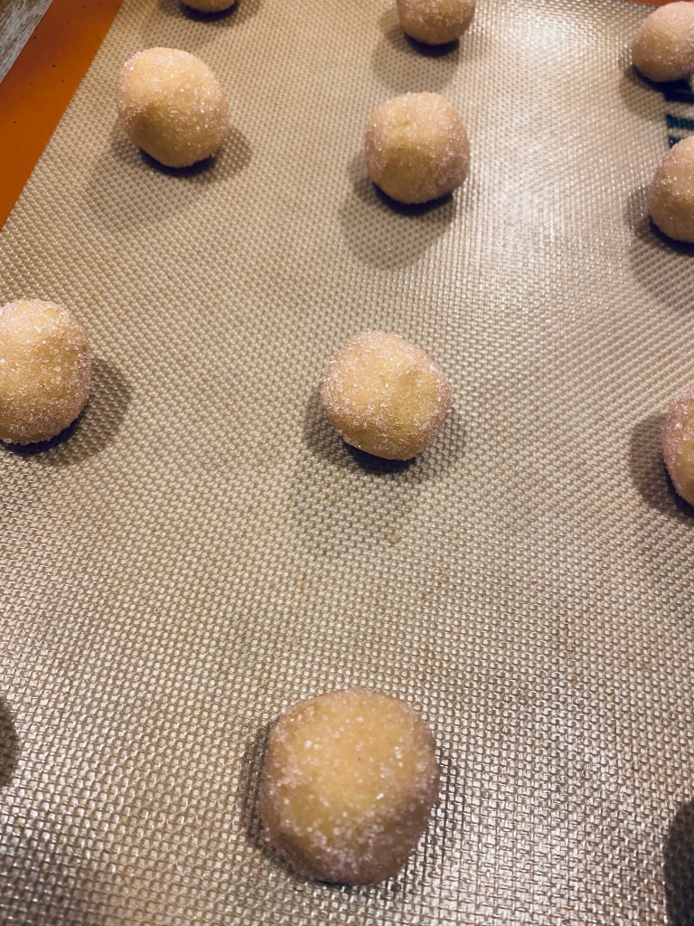 - Roll dough into heaping teaspoon sized balls and roll in sugar until coated.