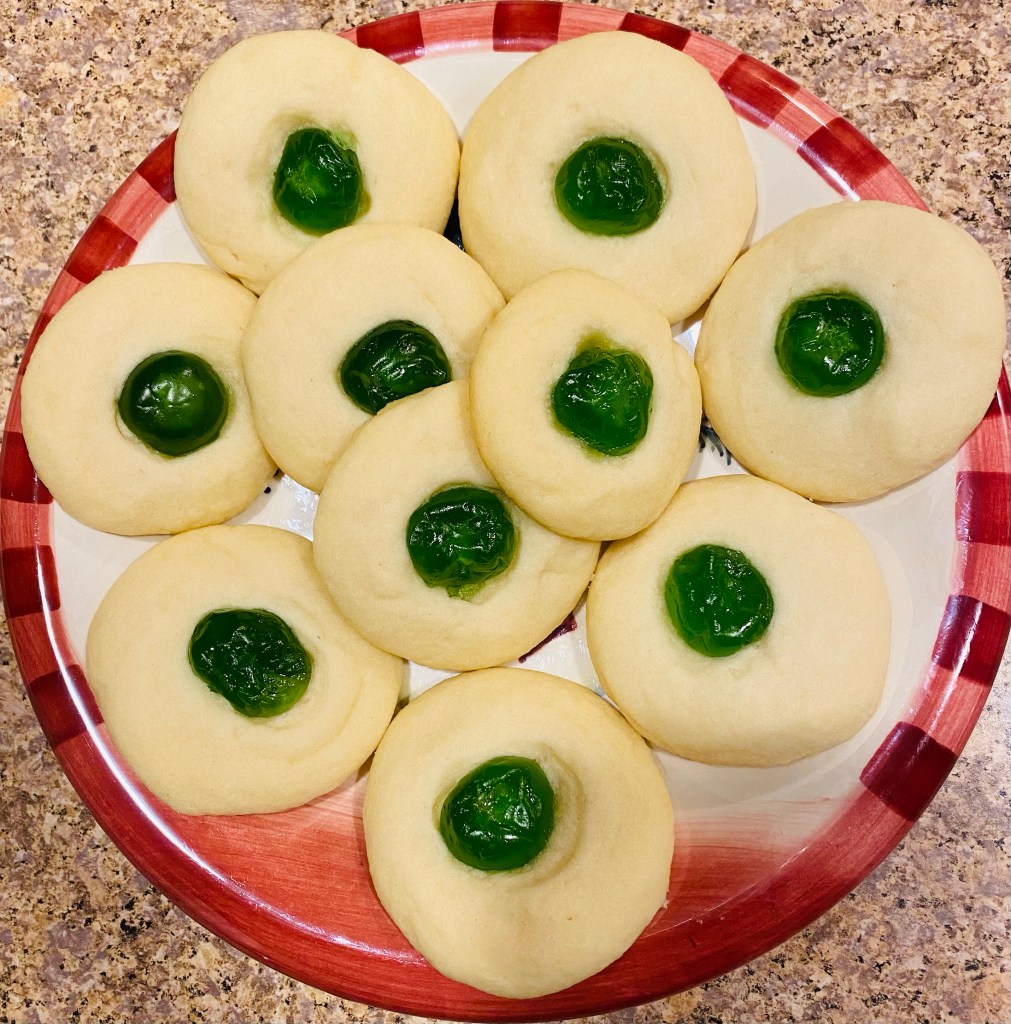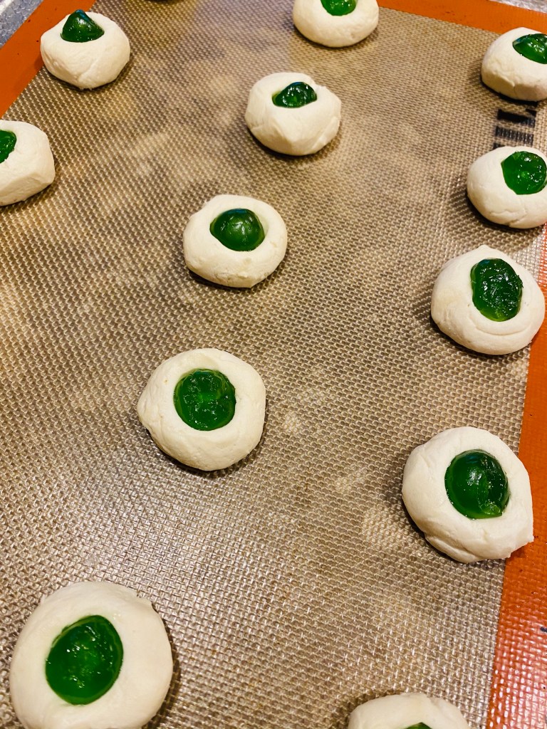 I like to rub some oil on my hands before handling this dough. Because it is such a different consistency from regular shortbread it can be very sticky and light to work with. When you get the cookies rolled gently press cherries into the top until they are about 2/3 covered (they’ll look similar to a bird’s nest). Just make sure you don’t eat too many of the cherries before they make it into the cookies!