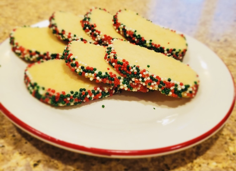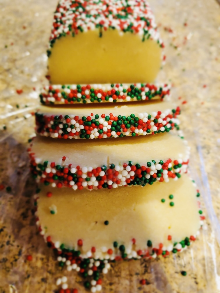 After letting this chill overnight I put it in the freezer for two hours. This will help the dough keep its shape while cutting. When slicing you will want to cut the cookies a 1/4 inch thick. Inconsistencies in thickness will result in varied baking times. If it’s easier you can place a ruler next to the dough to ensure your slices are even. Also, this will shed sprinkles as you handle and cut it – don’t worry about the mess!