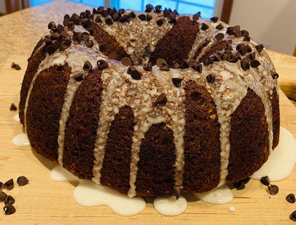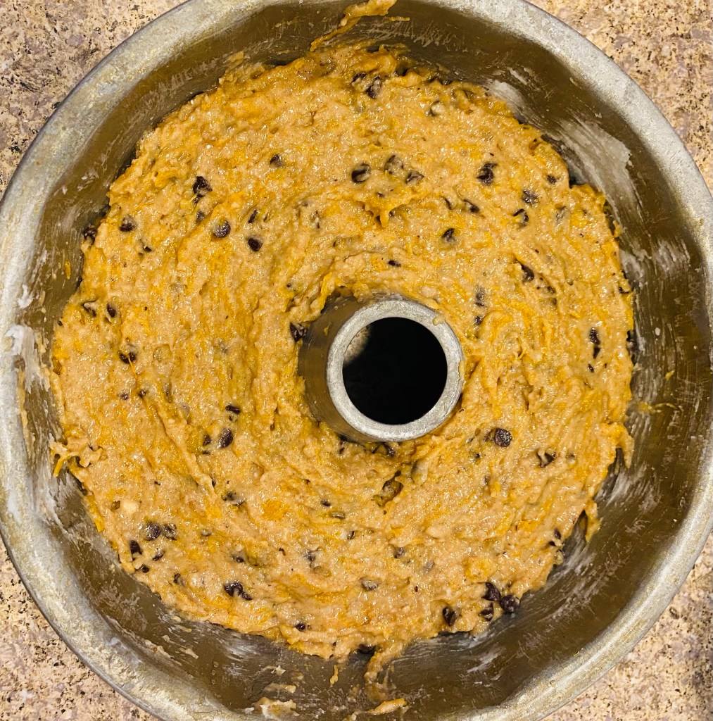 - Preheat oven to 375 degrees Fahrenheit and grease a Bundt pan (or two bread pans) and set aside.