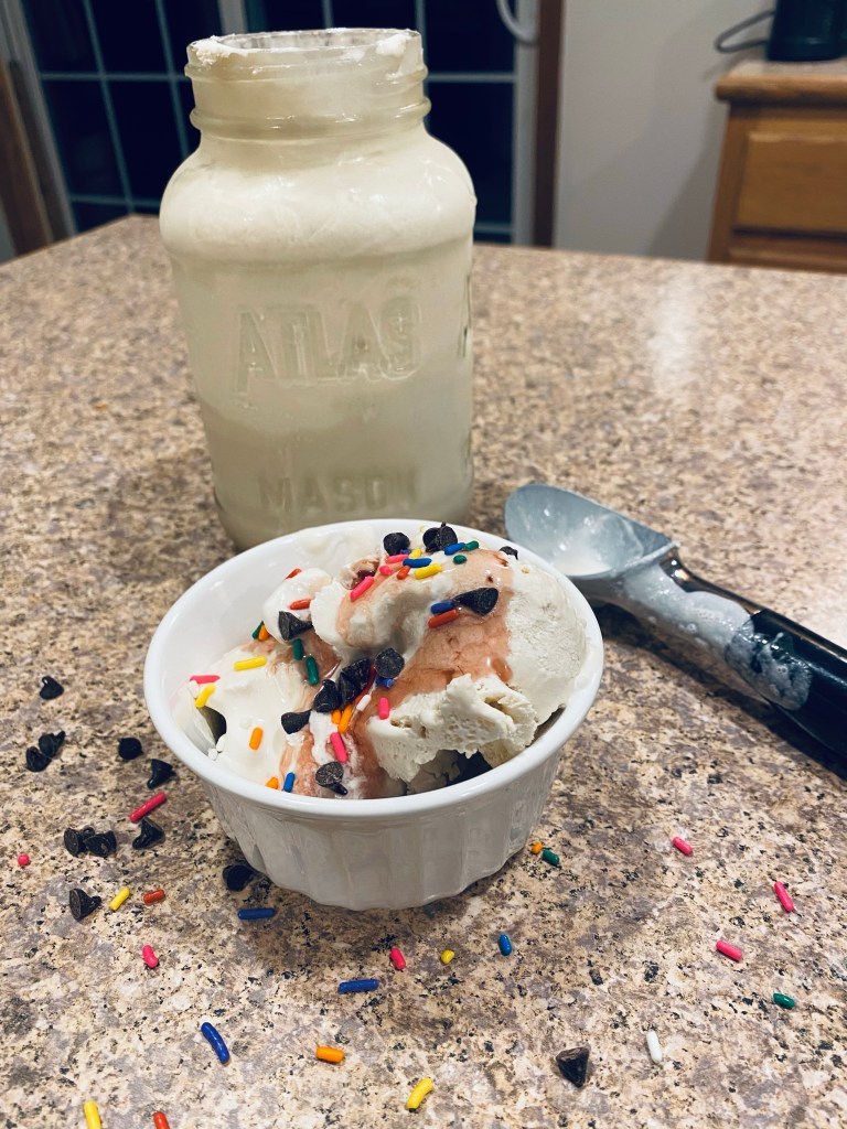 I happen to love vanilla ice cream. I make my own vanilla extract and it makes the flavor amazing. You can substitute other extracts to change the flavor: cinnamon, coffee, lemon or even peppermint. For a fruity flavor omit the sugar and add two tablespoons of your favorite jam or jelly. If you’re a chocolate lover you can add two tablespoons of cocoa powder. Or, if you’re like my daughter and myself and love just plain vanilla then you can add fun toppings – our personal favorite is sprinkles.