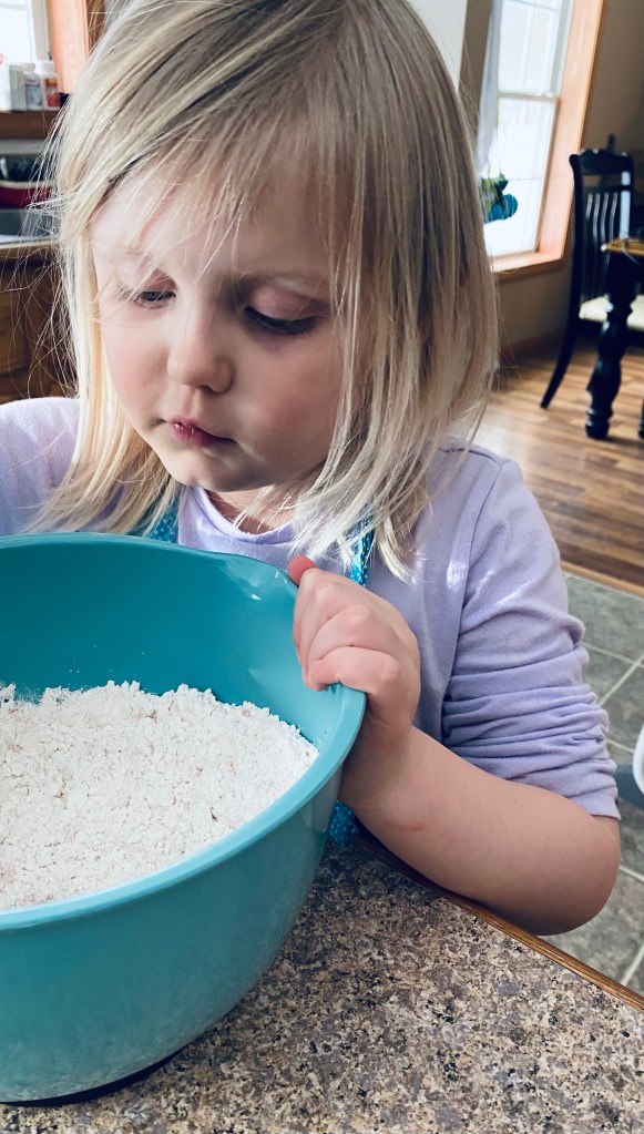 Around each holiday I enjoy doing small projects with my daughter to get her into the spirit. She happens to really love Valentine’s Day which makes everything all the more fun. Not only will she have fun playing with this playdough in the coming weeks, but she had fun making it with me.
