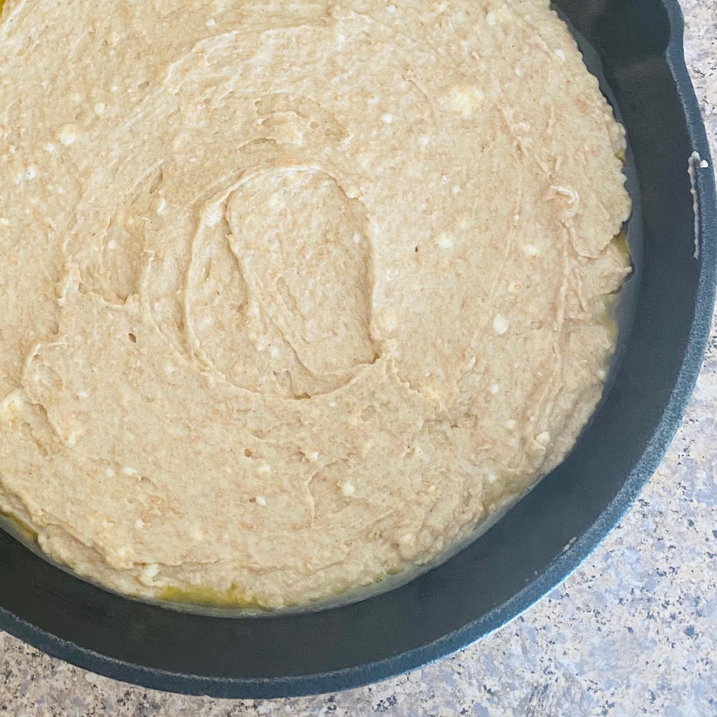 - Transfer batter to cast iron skillet smoothing it out evenly.