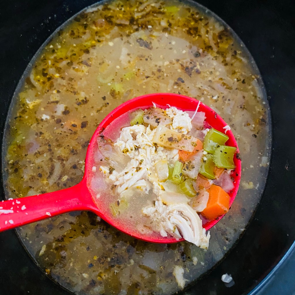 - Add chicken, chicken stock, cooked veggies and spices to the crock pot and cook on low for six hours or high for three hours.