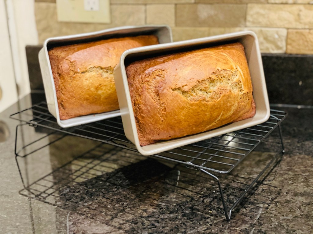 - Divide batter between the two loaf pans and place in oven to bake for approximately an hour (bread should be cracked along the top and a knife should come out clean).