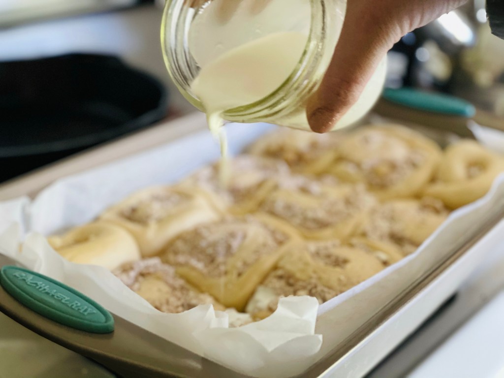 Drizzling warm heavy whipping cream helps the sweet rolls to retain their moisture while baking. By helping lock in the moisture these remain fluffy and gooey – something I associate with good gourmet style sweet rolls. After baking, the white chocolate ganache rounds out the amazing flavor. Beware, these are addicting! You might be tempted to enjoy more than one.