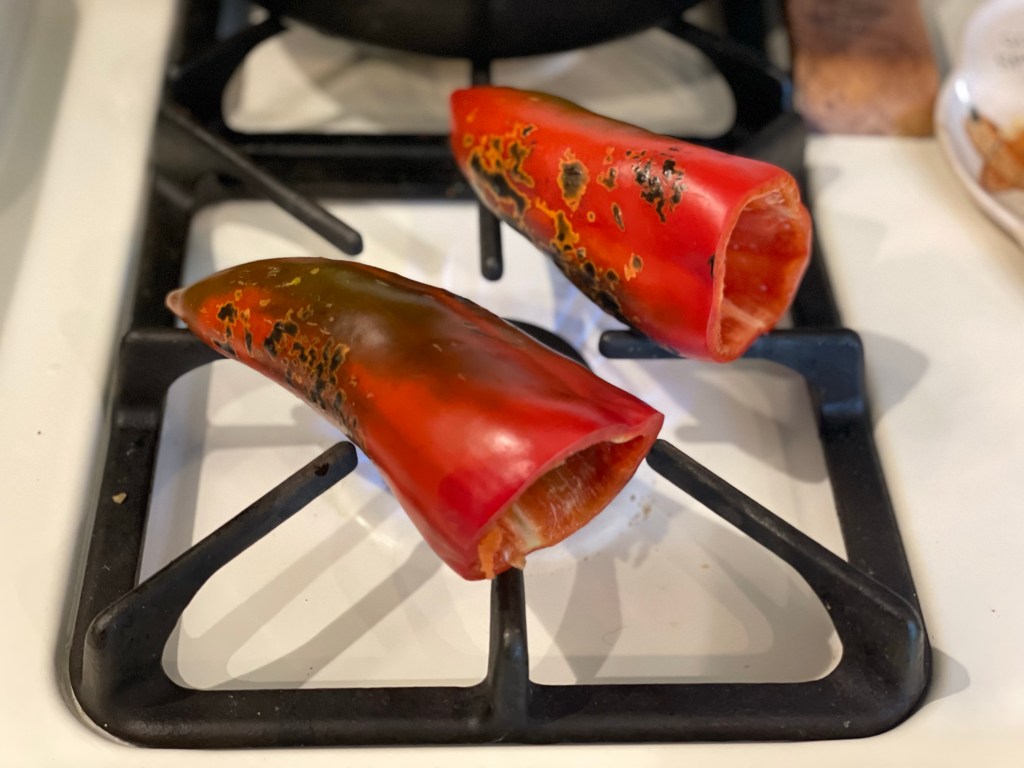 For the soup you will want to fully remove the seeds, veins and skins. The easiest way to remove the skins is to blister the peppers over a stove burner or a grill. Then place all the peppers in an airtight container for 10 minutes to allow the skin to moisten and start to separate. With this method the skins should easily slip off. You want to get the pepper’s skins as dark as possible. Not only does it help the skins slip off; it makes the flesh weep which brings out the sweetness of the pepper.