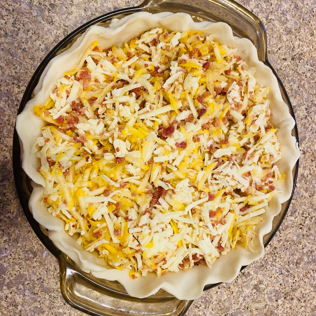 I mix all my filling ingredients together and spread evenly through the crust. Then I pour my egg and milk mixture over top making sure everything gets wet – this helps prevent scorching. It’s very easy to tell when it’s done baking by gently shaking the pie plate. If the mixture is loose then the quiche is not done. If it has more of an elastic consistency then it’s ready!