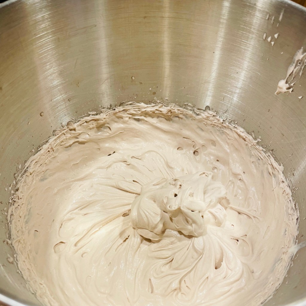 I used my stand mixer with the whisk attachment to whip up the topping. A hand mixer would work as well – just make sure your bowl is big enough as this does grow considering size. If you don’t have an electric mixer and feel up to the challenge you can whip this by hand using a whisk or fork – it will take about 20 minutes of whipping. This would be a great way to get kiddos to help and you can add on a small science lesson about fat molecules, friction and states of matter. Win, win!
