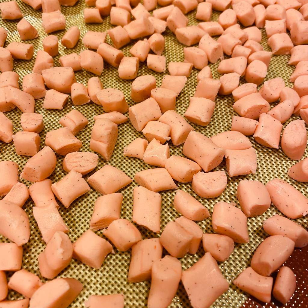 When I was little I loved those pastel colored after dinner mints you would find in restaurants. These butter mints remind me of those fun little treats; however, these are so much better. They are creamy and sweet with a minty fresh after note in flavor. We had a very hard time not eating these before their drying time was up.