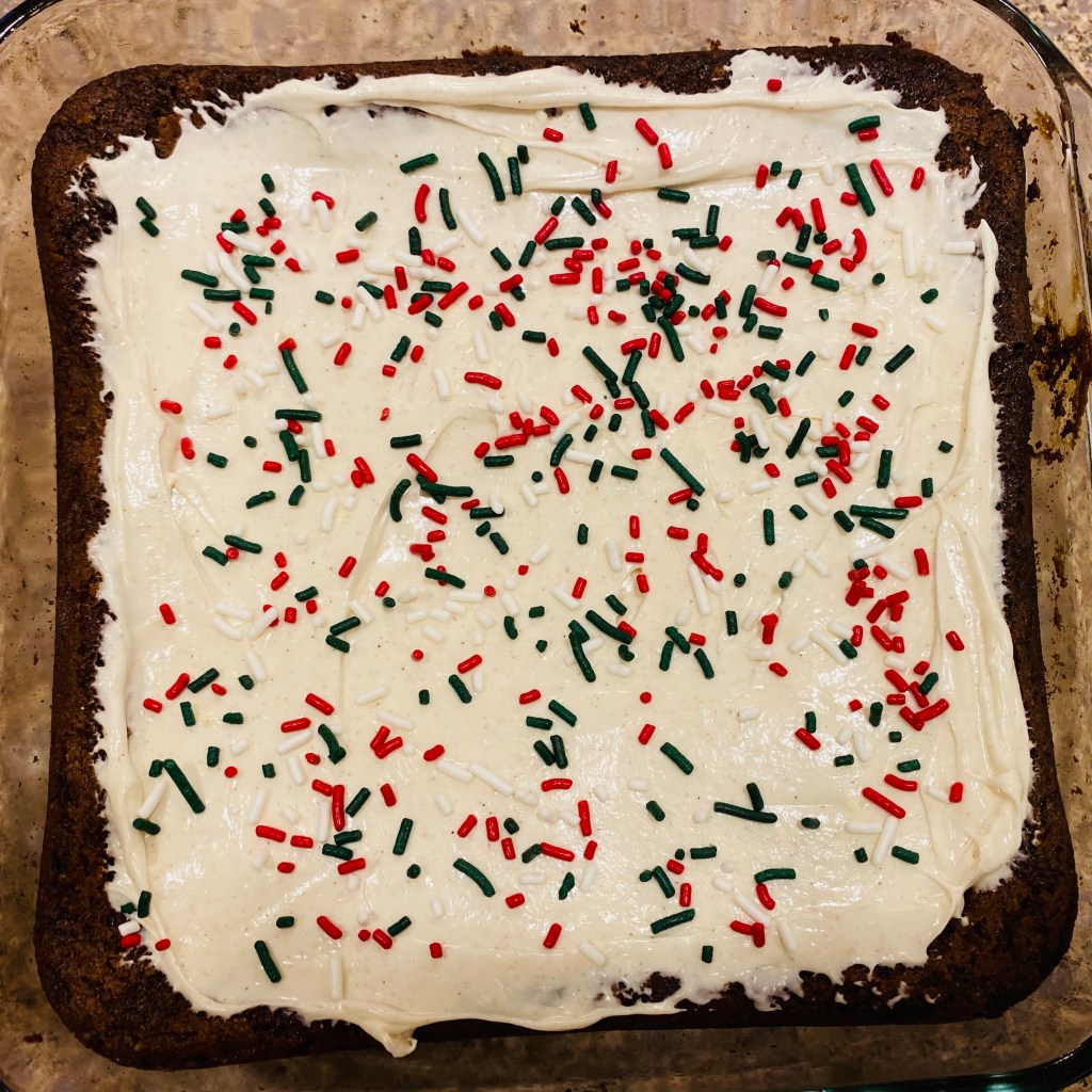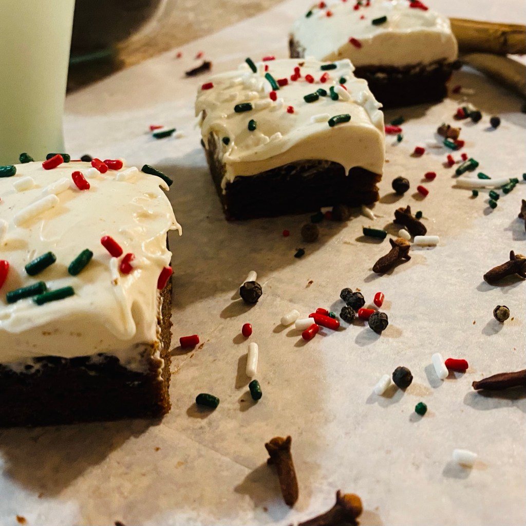 - Once completely cooled, frost gingerbread bars with cream cheese frosting and top with sprinkles.