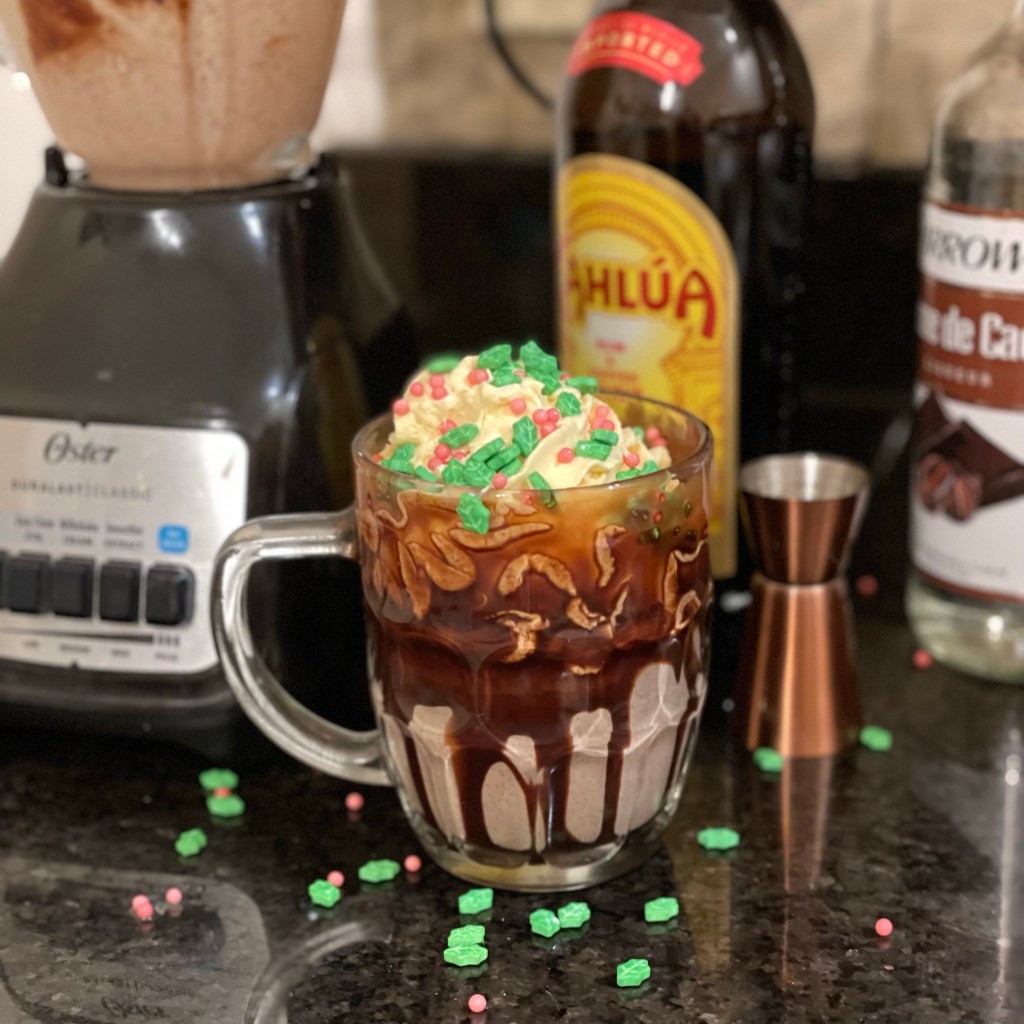 - In a blender combine ice cream, ice, kahlua, creme de cacoa and chocolate sauce.