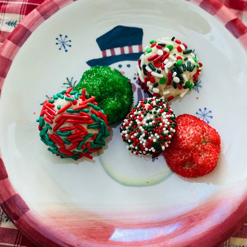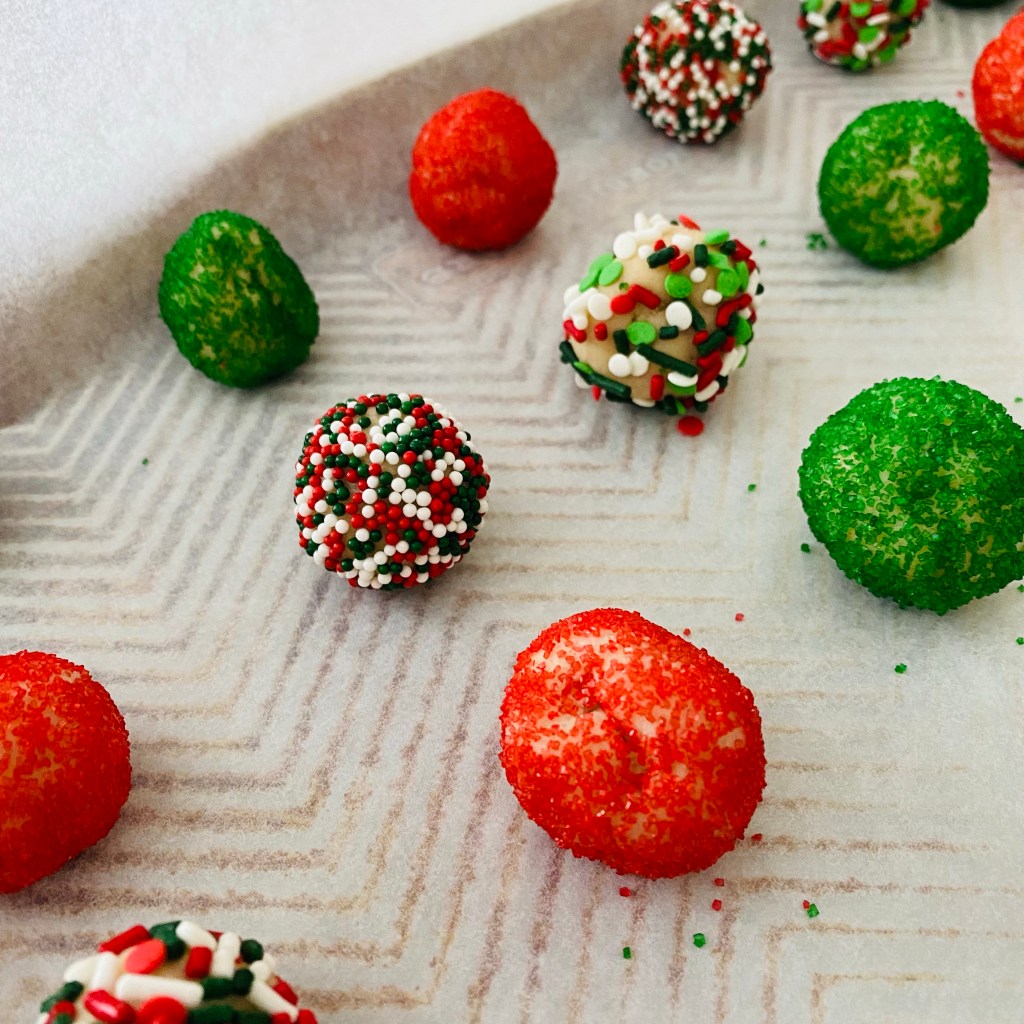 - Roll cookie dough into tablespoon sized balls and cover completely with sprinkles.