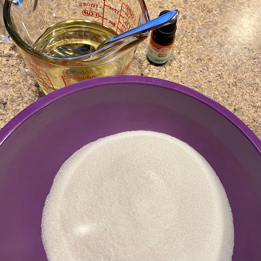 Sugar scrubs are relatively easy to make and I find they are great little gifts for friends, coworkers and teachers. Part of the appeal is the sensory details that make up the scrub. The first one that most people notice is the scent. This recipe has a fun peppermint scent perfect for holiday time. The other detail is the grainy texture of the scrub. This is where our ingredients come into play.
