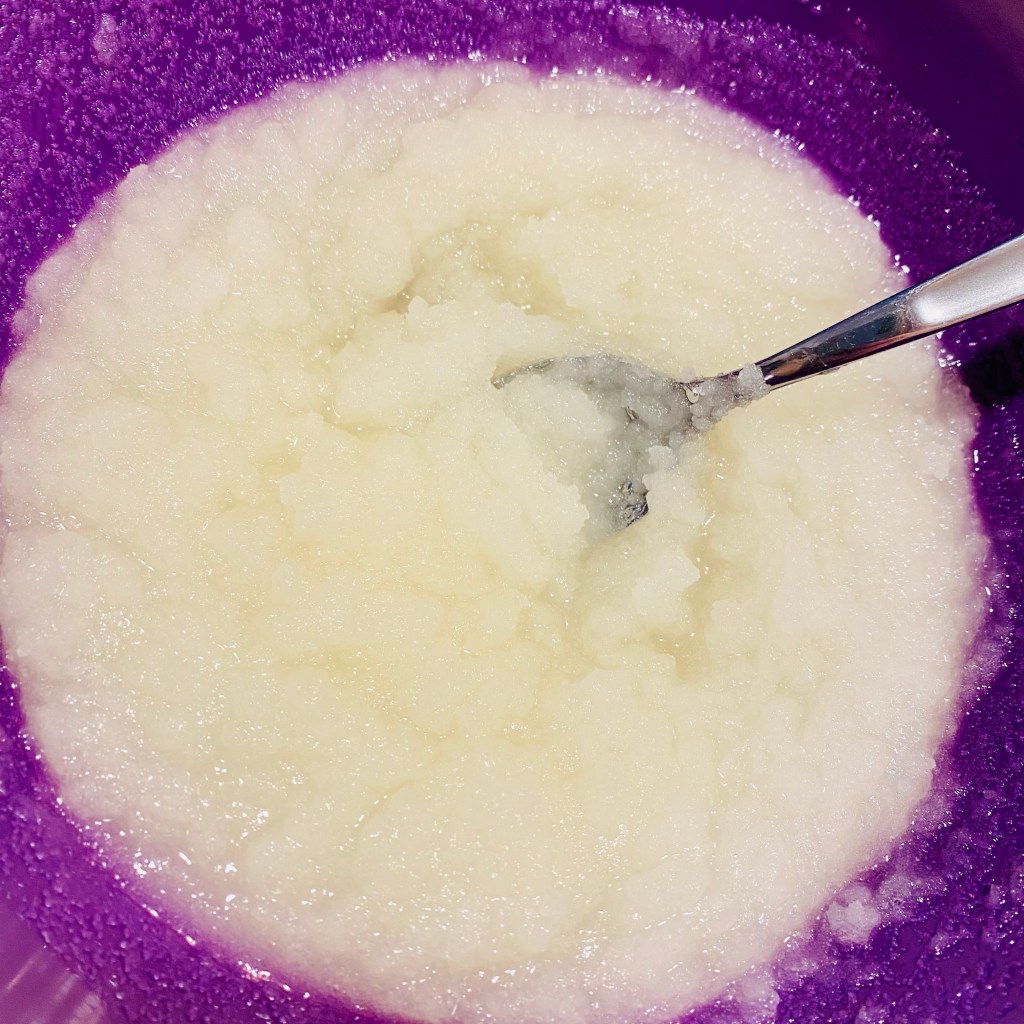 The other major component of the sugar scrub is sugar. For my sugar I used just regular granulated sugar; I don’t mind the finer texture. If you’re looking for something a bit more coarse you can use cane sugar. Part of the appeal with this recipe is the pretty white color it comes out to be – the other is the fun peppermint scent. For both of these reasons I do not recommend using brown sugar. One mixed together you will want to store the scrub in an airtight container – like a glass mason jar. Beware that glass can become slippery when using this product around water. I combat this minor issue by using a silicone sleeve on my mason jar making it much safer in the shower.